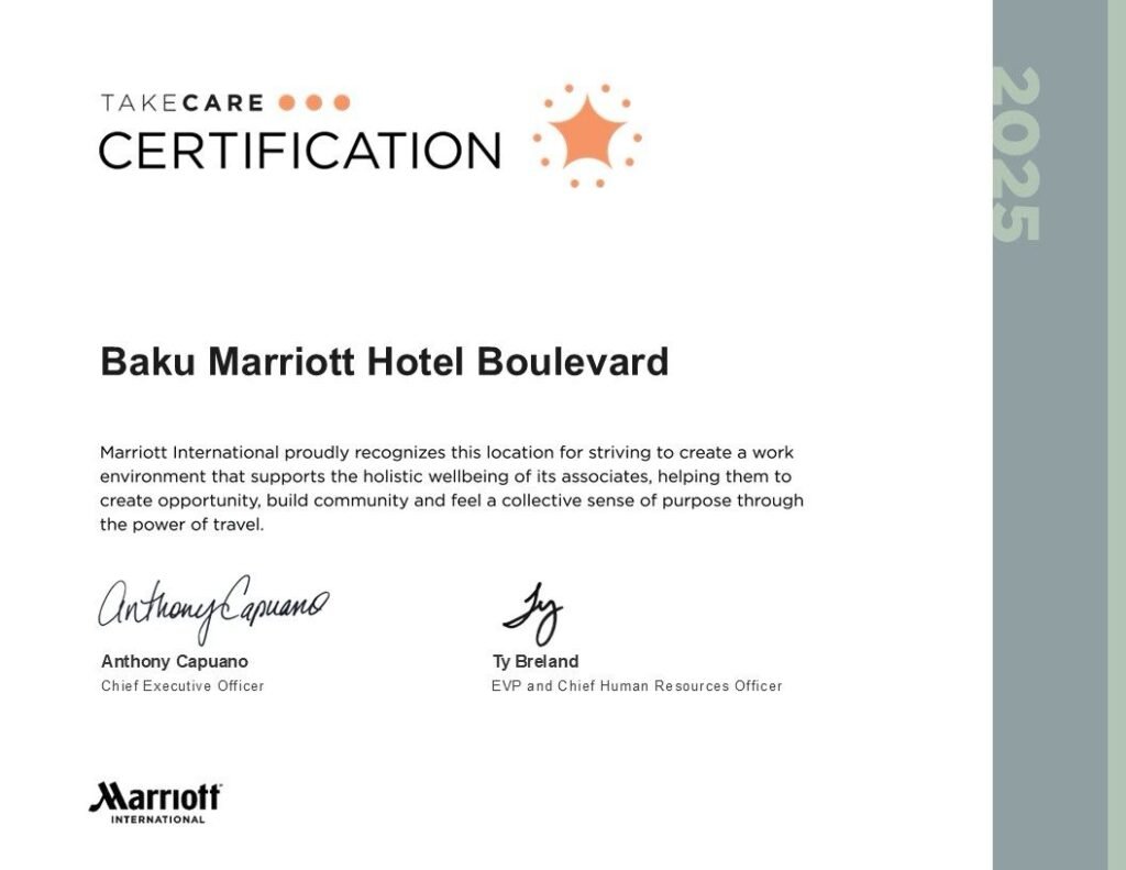 “Baku Marriott Hotel Boulevard” əməkdaşların rifahına və insan mərkəzli idarəetmə modelinə verdiyi önəmə görə “TakeCare” Sertifikatına layiq görülüb.