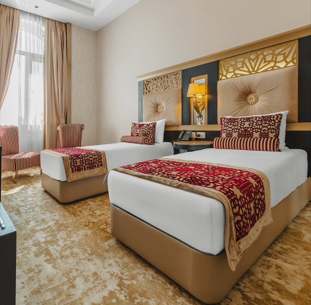 Gabala Karvansaray Hotel 159 otaqdan ibarət, Şərq üslublu memarlığı və tarixi karvansaray ab-havasını özündə əks etdirən böyük turizm kompleksidir. Oteldə standart, superior, ailələr üçün geniş ailə otaqları, eləcə də böyük və komfortlu suite otaqlar mövcuddur ki, bu da müxtəlif kateqoriyalı qonaqlar üçün rahat seçim imkanı yaradır.